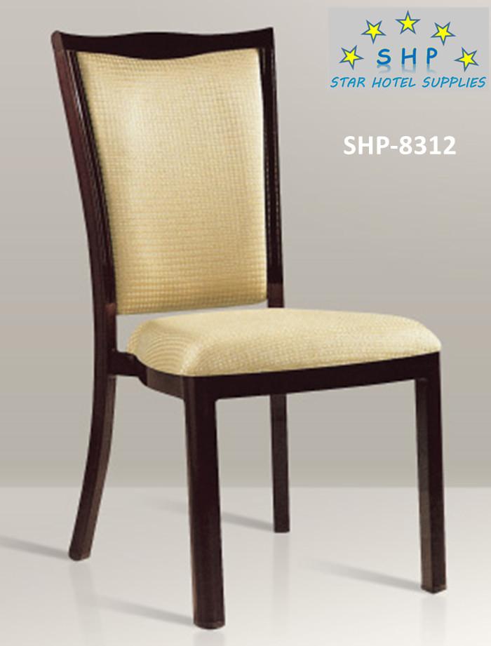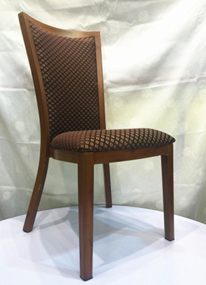 Modern beige fabric brown aluminium tubular imitated wood stacking dining chair upholstered with soft cushion